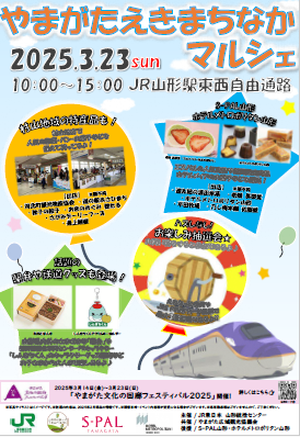 村山地域のお菓子や総菜などの特産品の販売や、各地の観光イベント情報をPRする「やまがたえき まちなかマルシェ」を下記のとおり開催します! 日時:3月23日(日)10時から15時まで 場所:JR山形駅「東西自由通路」 地域の特産品や観光情報が満載!きてけろくん、ペロリン、つどりぃ、はながたベニちゃんなどご当地キャラも大集合!ステージイベントでは、剣劇、ミニコンサート、ダンス・踊りパフォーマンスと盛りだくさんの一日です。村山地域の菓子や総菜等の販売を行う「マルシェ」や、花笠踊り、ストリートダンスパフォーマンス、ご当地キャラふれあいといった会場全体を盛り上げる「ステージイベント」など、内容も盛りだくさん! 皆さん、ぜひお越しください!! チラシはこちら