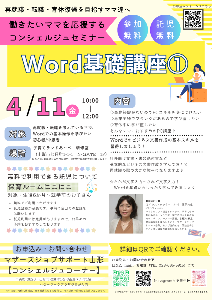 コンシェルジュPC講座「ワードの基礎スキル@」を開催します!◇:*:☆:*:◇:*:☆:*:◇:*:☆:*:◇:*:☆:*:◇Wordの基本的な機能と操作方法をお伝えします。表の作成や編集、文章の編集など実際にパソコンを触って自分のパソコンスキルをチェックしてみませんか?効率アップのワザを習得し、強みにしよう!簡単なチラシ作りにも挑戦してみましょう! 【日時】 4月11日(金) 10:00〜12:00 【会場】 子育てランドあ〜べ 研修室【定員】 10名【託児】 あり 定員があります お早めにご予約ください【受講料・託児料】 無料 ご興味のある方はお早めにお気軽にお問合せください♪お問い合わせマザーズジョブサポート山形【コンシェルジュコーナー】TEL:023-665-5915お申込みメールはコチラLINEはトーク画面にて「お名前、お申込み講座、託児の有無、お電話番号」を送信してください