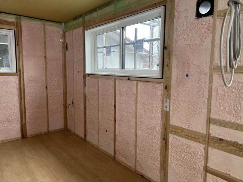 みなさん、こんにちは。私が担当しております新築工事で断熱材の施工を行いました。断熱材にも、様々な種類がありますが、今回は、硬質ウレタンの吹付けを行いました。引き続き安全第一で工事進めて参ります。