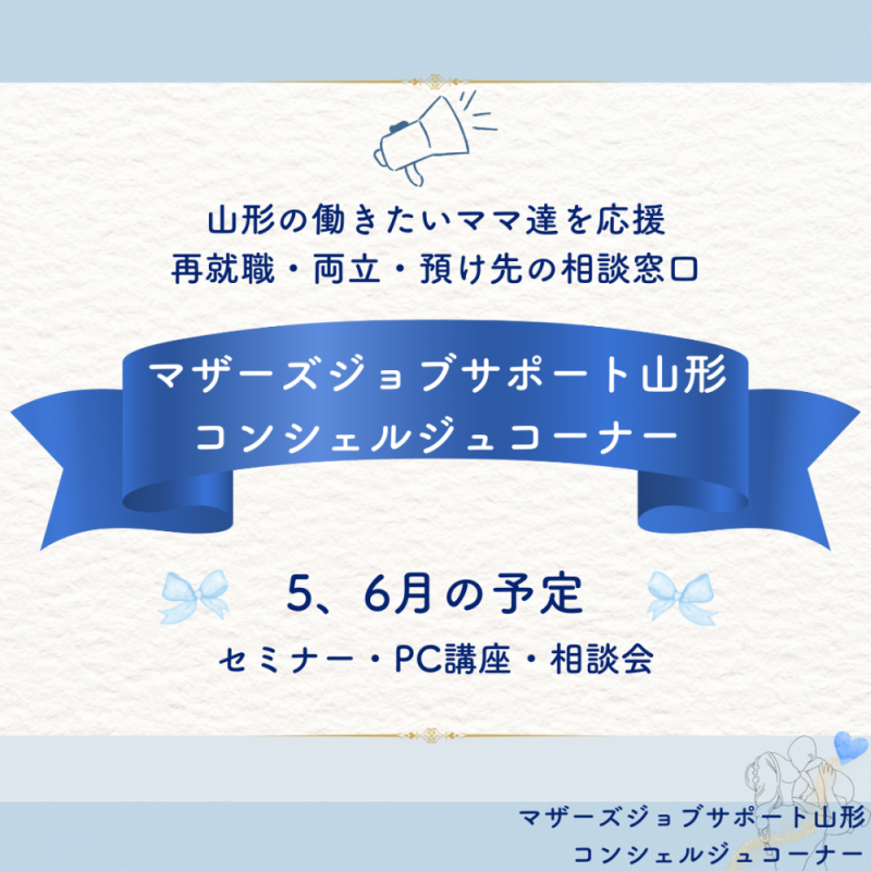 こんにちは!マザーズジョブサポート山形【コンシェルジュコーナー】です♪5、6月開催のセミナー、講座のお知らせです!  ☆「自分軸で生きる人生設計」 ☆PC講座「Word講座A」 ☆「働く準備をしよう」 ☆社労士個別相談会 ☆働くママのための心のケアセミナー ☆働くママの基礎知識〜お金とキャリアアップ〜 ☆Excel基礎講座@ ☆マザーズおしごと相談会in米沢 お申込は各チラシ画像をクリックしてリンク先からお願いします定員に限りがあるためお早めにどうぞ!LINEはトーク画面にて「お名前、お申込み講座、託児の有無、お電話番号」を送信して返信をお待ちくださいマザーズジョブサポート山形コンシェルジュコーナーからの返信をもって申込受付完了となります。☆メール・LINE・電話での対応は 開庁日のみとなります。 メール、LINEは開庁時間内で 返信いたします。  出張相談会のご案内------------------------------------------5/14(水) 10:00〜11:30おしごと相談会@べにっこひろばお子さんをひろばで遊ばせながら再就職・両立・預け先のこと気軽に話してくださいね。お待ちしております♪ ------------------------------------------ 上記の他、窓口相談はもちろん!随時、オンライン相談も受け付けています!なかなか外出できないけど誰かに話したいモヤモヤ相談したいけど、セミナー受けたいけど遠方に住んでいて出かけられない…そんなママはぜひ、オンライン相談をご活用ください♪詳細はコチラ! ぜひ、ママの一歩、お待ちしています♪気になるものがありましたらどうぞ、お気軽にお問合せくださいね!お問い合わせマザーズジョブサポート山形【コンシェルジュコーナー】TEL:023-665-5915