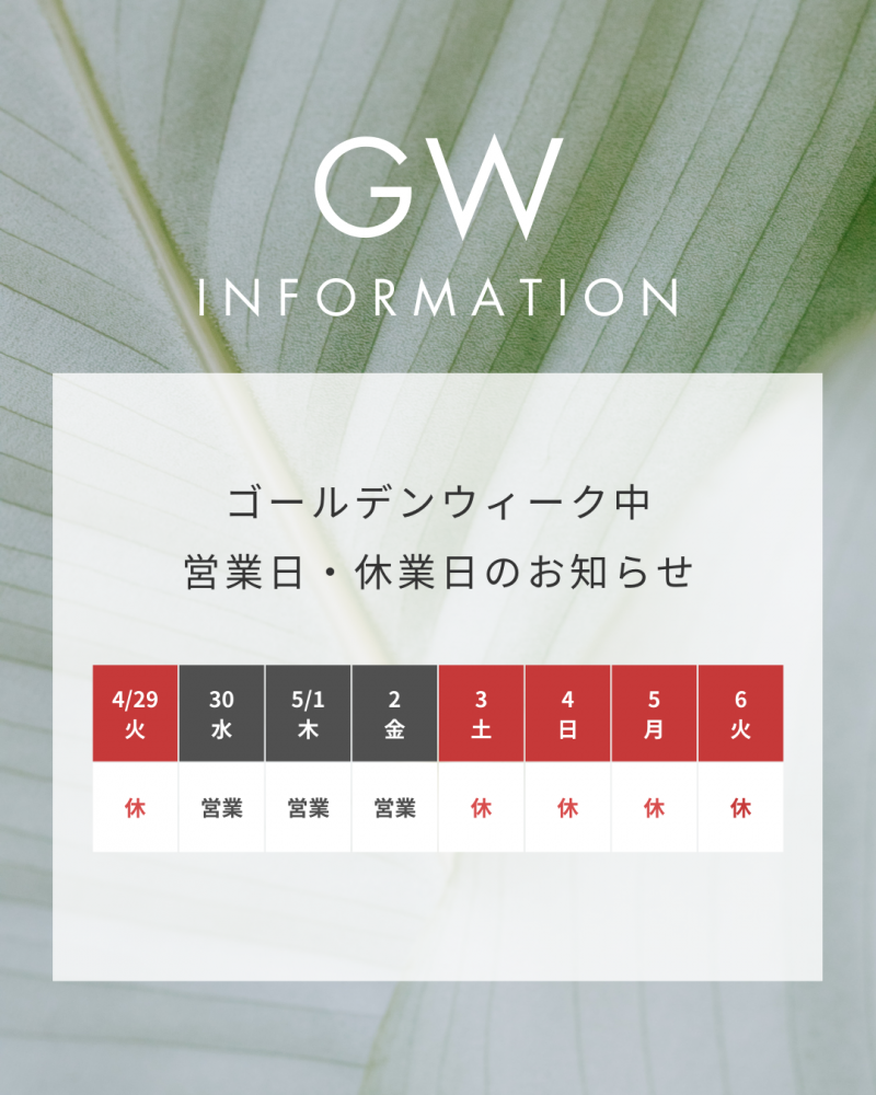 平素は格別のご高配を賜り厚く御礼申し上げます。弊社では、誠に勝手ながら下記日程をGWの休業とさせて頂きます。 □GW休業期間□7年4月29日(火)7年5月3日(土)〜7年5月6日(火)休業期間に頂いた お問い合わせにおいては営業開始日以降に順次回答させて頂きます。皆様には大変ご不便をおかけいたしますが、何卒ご理解の程お願い申し上げます。