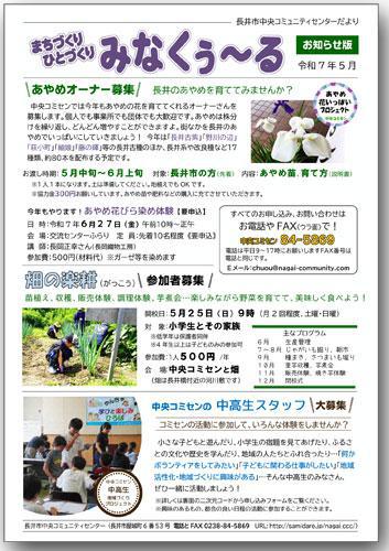 長井市中央コミュニティセンターだより「みなくぅ〜る」のお知らせ版を発行しました。長井市中央地区の皆様には本日、全戸配布をお願いしています。 今年も行う「あやめオーナー&あやめ花びら染め体験」の参加者の募集。「畑の楽耕(がっこう)」の参加家族の募集、コミセンで楽しく活動してくれる「中高生スタッフ」の募集を行っています。いずれも長井市民の方、市内の事業所等を対象とした募集となります。(市内の方を優先させていただきますのでご理解ください。) ▽詳しくはこちらからみなくぅ〜る お知らせ版 令和7年5月 あやめオーナー&あやめ花びら染め体験申込フォーム畑の楽耕申込フォーム中高生スタッフ申込フォーム Instagramはこちら