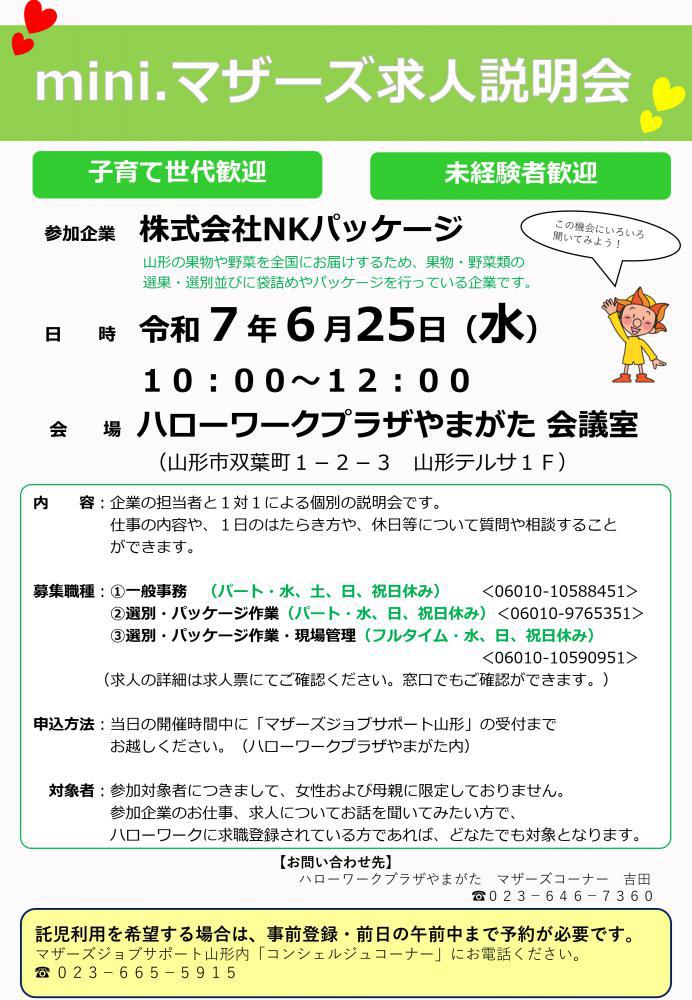 6月25日「求人説明会」のお知らせ「mini.マザーズ求人説明会」を開催します。 ★事前連絡不要★履歴書不要 ★普段着参加OK 今回は、「株式会社NKパッケージ」です! 参加希望の方は、当日の開催時間中にプラザ奥側マザーズジョブサポート山形受付までお越しください。 日時:令和7年6月25日(水) 10:00〜12:00 開催時間中のお好きな時間に お越しいただけます。 会場:ハローワークプラザやまがた 会議室 (山形市双葉町1-2-3 山形テルサ1F)※県民べにばな駐車場をご利用の方には、 最大2時間分までサービス券を配布いたします。 駐車券をご提示ください。 内容:企業の担当者と1対1による個別の説明会です。 仕事の内容、1日のはたらき方や、 休日についてなど質問や相談をすることができます。 【お問い合わせ先】 ハローワークプラザやまがた 吉田 TEL:023-646-7360