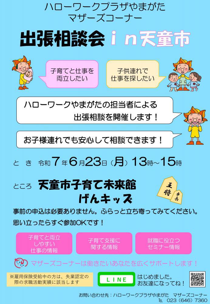 6月23日「出張相談会」のお知らせ 天童市げんキッズにて「出張相談会in天童市」を開催します。 ハローワークやまがたの担当者による出張相談会です。※雇用保険受給の方は、失業認定の際の求職活動実績に該当します。 ★事前の申込は必要ありません。気軽にふらっとお立ち寄りください。お子さん連れでも安心して相談できます♪ 日時:令和7年6月23日(月)   13:00〜15:00   開催時間中のお好きな時間に   お越しいただけます。 会場:天童市子育て未来館げんキッズ     (山形県天童市芳賀タウン北2-7-18) 【お問い合わせ先】 ハローワークプラザやまがた           吉田 TEL:023-646-7360