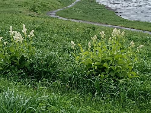 天元台高原、リフトセンター前のところの「コバイケイソウ」(小梅~草)が咲きました、ここにヒメサユリとニッコウキスゲが咲いてきますが今年は遅くこれからのようです、最初の花がコバイケソウ・・・ユリ科の多年草で、名前の由来は花が梅の花に似て、葉が~草に似ているからとある、大型で1mほどになる穂先に白い花を密集し群生する。通常2〜3年毎に花を咲かすが、リフトセンター前のとこは毎年咲いている・・明日は夏山安全祈願祭である。