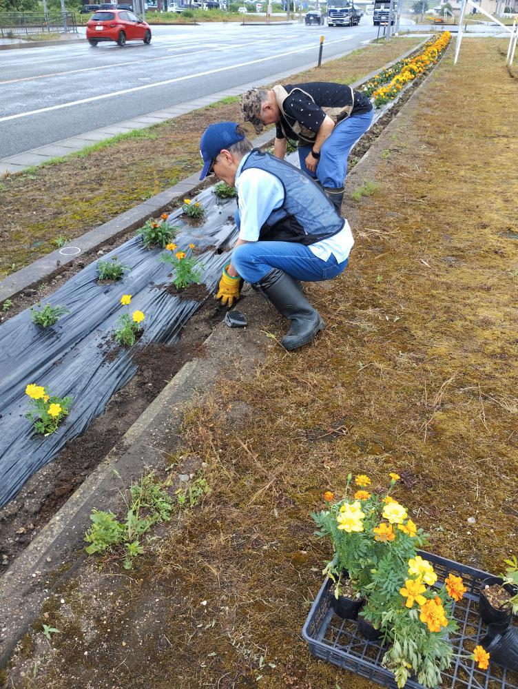 川樋交差点花壇のマリーゴールドが、一部枯れてしまったため、本日、新たに12本マリーゴールドを植えてきました。館長と私と、なんと心強い助っ人!!川樋地区から衛生組合員のお二人が、雨の中お手伝いに来てくださいました(*・ω・人・ω・*)感謝おかげで、交差点花壇の枯れた花芽摘みや草むしりまで、あっという間に終わりました\(^o^)/ありがとうございました!こまめなお手入れのおかげで、モリモリ育っています☆