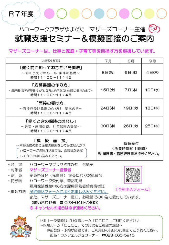 2025年、7月、8月、9月のマザーズ就職支援セミナー と模擬面接 のお知らせです! 【マザーズ就職支援セミナー】マザーズコーナー(ハローワーク)のスタッフが、毎月4つのテーマでご説明します。 ★『働く前に知っておきたい労働法』「賃金支払いのルールって?」「社会保険や雇用保険の加入条件は?」「育休は正社員じゃなくても取れる?」etc.求人票の項目に沿って、基本的なことをご説明します。【日時】7月8日(火)8月6日(水)9月4日(木) ★『応募書類の作り方』履歴書・職務経歴書・添え状…書き方に不安はありませんか?基本的な記載方法からマザーズ向けの好事例など分かり易くご説明します。【日時】7月15日(火)8月7日(木)9月10日(水) ★『面接の受け方』「書類は通るけど面接が…」や「面接は苦手…」と思われている方基本的なマナーや面接の流れを説明いたします。短時間ですが、参加された皆さんと一緒に入室・退室も練習予定です。【日時】7月24日(木)8月19日(火)8月18日(木) ★『働くときの保険のはなし』雇用保険、社会保険(健康保険、厚生年金)を加入する基準とは?よく耳にする「扶養の範囲内」で働くとどうなるの?働くときの保険について、基本的なことをご説明します。【日時】7月30日(水)8月26日(火)9月25日(木) ◎ 会場はいずれも ハローワークプラザやまがた内 会議室◎ 時間はいずれも 11:00〜11:45◎ 託児:無料(事前予約が必要)◎ 定員:8名(先着順)◎申込み方法: マザーズコーナー窓口、または お電話でお申込みください※キャンセルの場合も 事前にご連絡ください。◎持ち物:ハローワーク受付票、筆記用具※雇用保険受給中の方は 雇用保険受給資格者証 【マザーズ模擬面接】スーツ着用で臨んでいただく本番面接を想定した面接です。ご希望の日時で事前にご予約ください。◎会場 ハローワークプラザやまがた内 会議室◎託児 無料(事前予約が必要)◎持ち物 ハローワーク受付票、筆記用具 履歴書の写 ※雇用保険受給中の方は 雇用保険受給資格者証 お問い合わせはハローワークプラザやまがたTEL:023-646-7360 託児ご利用の方はマザーズジョブサポート山形【コンシェルジュコーナー】までお問合せくださいTEL:023-665-5915