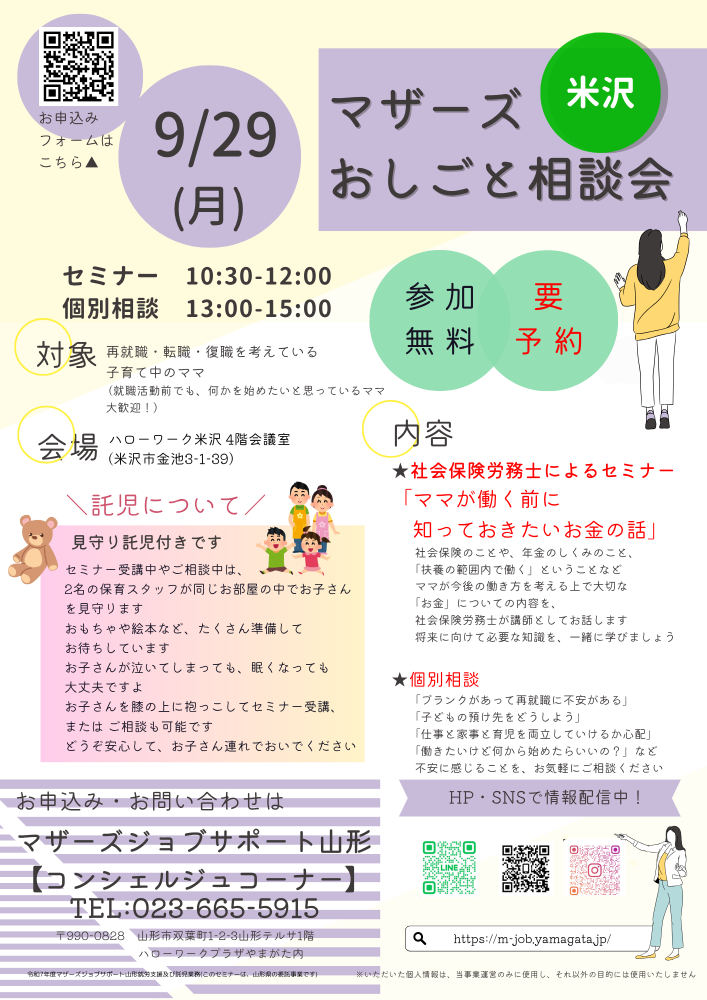 ◇:*:☆:*:◇:*:☆:*:◇:*:☆:*:◇:*:☆:*:◇ 「おしごと相談会in米沢」9月開催のお知らせです。 9月29日(月)@10:30〜12:00  社会保険労務士による セミナー『ママが働く前に知っておきたいお金の知識』社会保険のことや、年金のしくみのこと、「扶養の範囲内で働く」ということなどママが今後の働き方を考える上で大切な「お金」についての内容を、社会保険労務士が講師としてお話します将来に向けて必要な知識を、一緒に学びましょう ※お申込みが必要です・受講料無料 A13:00〜15:00  個別相談 おしごとに関すること、子育てに関すること、仕事と家事との両立に関することなど、不安に感じることをお気軽にご相談くださいね。 ※お申込みが必要です・利用料無料 【場所】ハローワーク米沢 4階会議室(住所:米沢市金池3-1-39) マザーズジョブサポート山形は就職活動に役立つセミナーを開催いたします。また、おしごとや育児との両立に関する個別のご相談も承ります。お子さんと一緒に、お気軽にお越しください。お子さんと同じお部屋でセミナーを受講し、相談することができます。同行する保育スタッフが、お子さんを見守りいたします。 □お問い合わせ□マザーズジョブサポート山形【コンシェルジュコーナー】◇電話でのお申込み→023-665-5915◇お申込みメール→コチラ◇LINEでのお申込み→トーク画面にて・お名前・お申込み講座・託児の有無・お電話番号を送信してください。返信をもって申込完了となります。↓公式LINE追加はこちら↓☆メール・LINE・電話での対応は 開庁日のみとなります。 メール、LINEは開庁時間内で 返信いたします。