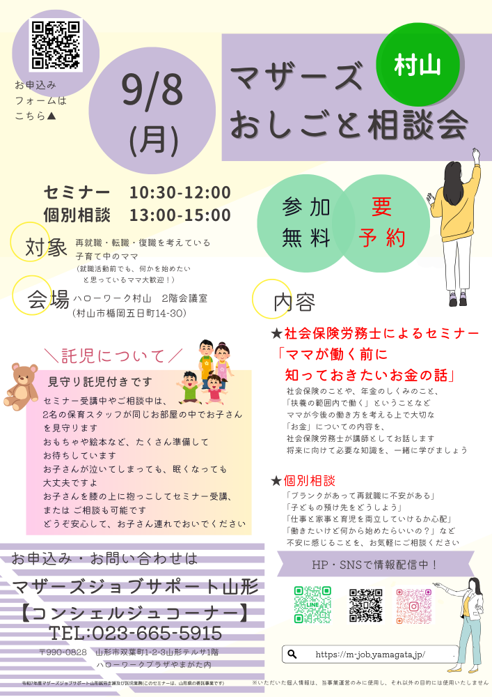「おしごと相談会in村山」9月開催のお知らせです。 9月8日(月)@10:30〜12:00 社会保険労務士によるセミナー『ママが働く前に知っておきたいお金の話』社会保険のことや、年金のしくみのこと、「扶養の範囲内で働く」ということなどママが今後の働き方を考える上で大切な「お金」についての内容を、社会保険労務士が講師としてお話します将来に向けて必要な知識を、一緒に学びましょう ※お申込みが必要です・受講料無料 A13:00〜15:00 個別相談 おしごとに関すること、子育てに関すること、仕事と家事との両立に関することなど、不安に感じることをお気軽にご相談くださいね。 ※お申込みが必要です・利用料無料 【場所】ハローワーク村山 2階会議室(住所:村山市楯岡五日町14-30) マザーズジョブサポート山形は就職活動に役立つセミナーを開催いたします。また、おしごとや育児との両立に関する個別のご相談も承ります。お子さんと一緒に、お気軽にお越しください。お子さんと同じお部屋でセミナーを受講し、相談することができます。同行する保育スタッフが、お子さんを見守りいたします。 □お問い合わせ□マザーズジョブサポート山形【コンシェルジュコーナー】◇電話でのお申込み→023-665-5915◇お申込みメール→コチラ◇LINEでのお申込み→トーク画面にて・お名前・お申込み講座・託児の有無・お電話番号を送信してください。返信をもって申込完了となります。↓公式LINE追加はこちら↓☆メール・LINE・電話での対応は 開庁日のみとなります。 メール、LINEは開庁時間内で 返信いたします。