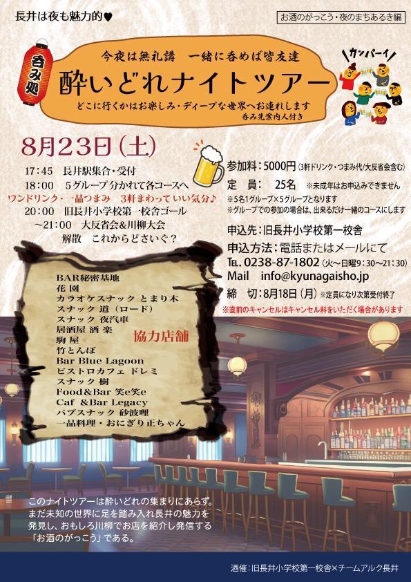 【酔いどれナイトツアー】【酒催】旧長井小学校第一校舎 × チームアルク長井 お酒のがっこう〜夜のまちあるき編〜として「酔いどれナイトツアー」を開催します★5名1グループとなり、長井市の飲食店を3軒飲み歩き♪いい気分になった後は、旧長井小学校第一校舎に戻って大反省会&川柳大会を行います。どこのお店に行くかはお楽しみ!呑み先案内人がディープな世界へお連れします。魅力あふれる夜の長井を堪能しませんか?【日時】8月23日(土)■17:45 長井駅 集合■21:00 旧長井小学校第一校舎 解散※詳細はチラシをご確認ください【酒催】旧長井小学校第一校舎チームアルク長井【協力店舗】※順不同★BAR秘密基地★花園★カラオケスナック とまり木★スナック 道(ロード)★スナック 夜汽車★居酒屋 酒楽★駒屋★竹とんぼ★Bar Blue Lagoon★ビストロカフェ ドレミ★スナック 樹★Food&Bar Legacy★パブスナック 砂波哩★一品料理・おにぎり正ちゃん【参加費】5,000円/1人 (3軒ドリンク・おつまみ代/大反省会含む)【定員】25名 ※未成年は申込不可■5名1グループ×5グループ■グループで参加希望の場合は、できるだけ一緒のコースにいたします【申込方法】電話またはメールにて、(名前・お住まいの市町村・年齢・電話番号)を添えてお申し込みください。電話 0238-87-1802メール info@kyunagaisho.jp※締切:8/18(月)もしくは定員になり次第終了【おねがい】*お車でお越しの方は飲酒運転を絶対にしないでください。*飲酒による事故、トラブル、物損等については主催者は責任を負いかねますのでご了承ください。※20歳以上の人のみご参加いただけます。当日身分証明書を確認させていただく場合がございます。※直前のキャンセル等につきましては、参加料相当のキャンセル料金を頂戴する場合がございますのでご了承ください。