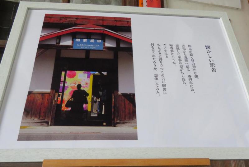 蛭川さんの『時季を刻む鉄道景』展の作品を紹介します。最初に紹介するのは「懐かしい駅舎」と題する作品。(一部を省略しています) 休みが続く日の静かな朝 窓越しに乗客の姿がちらほら 帰省客だろうか だとすると 久しぶりに降り立つこの古い駅舎に 何を思うのだろうか もうすぐ田舎の旧盆である。駅ノートにも「○年ぶりで帰省した」との記入もみられる。帰省客がこの駅に降り立った時、どんな思いが巡るのであろうか。この作品を見て改めて思った。