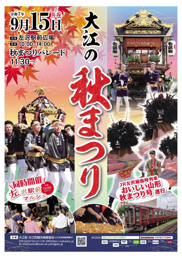 【2025】大江の秋まつり完全ガイド|伝統パレードの時間&マルシェ・臨時列車情報2025年9月15日(月・祝)、大江町で伝統芸能とグルメが一堂に会する「大江の秋まつり」が開催されます。歴史あるパレードや、美味しいものが並ぶマルシェで、大江町の秋を満喫しませんか? 開催概要開催日2025年9月15日(月・祝)時間10:00〜14:00会場JR左沢駅前広場 Googleマップで確認 まつりの2大見どころ! 秋まつりパレード江戸時代から続く獅子踊りや豪華な囃子屋台が次々と登場!歴史と迫力を間近で感じられます。時間:11:30〜13:30頃 左沢駅前マルシェパレードとあわせて楽しめるマルシェも同時開催!キッチンカーもやってきて、美味しいものが大集合します。時間:10:00〜14:00 タイムスケジュール10:00左沢駅前マルシェ 開始10:30大江町産すももプレゼント(先着500名)11:30秋まつりパレード 開始11:50JR左沢線 臨時特別列車 到着13:30頃秋まつりパレード 終了予定14:08JR左沢線 臨時特別列車 出発 アクセスはJR臨時列車が便利!当日はJR左沢線で臨時特別列車が運行されます。会場の駐車場には限りがあるため、公共交通機関のご利用がおすすめです。 よくある質問 (FAQ)駐車場はありますか?はい、会場周辺に駐車場が用意される予定です。ただし、数に限りがあり混雑が予想されるため、JR左沢線で運行される臨時特別列車のご利用が便利でおすすめです。まつりの一番の見どころは何ですか?11時30分から始まる「秋まつりパレード」が最大の見どころです。江戸時代から続く歴史ある獅子踊りや、豪華な囃子屋台が次々と登場し、伝統芸能の迫力を間近で感じることができます。すももプレゼントは何時からですか?大江町産のすももプレゼントは、10時30分から先着500名様限定で配布予定です。なくなり次第終了となりますので、お早めに会場へお越しください。イベントの最新情報は公式サイトをご確認ください。大江町観光物産協会 公式サイト {"@context":"https://schema.org","@graph":[{"@type":"Festival","name":"大江の秋まつり","startDate":"2025-09-15T10:00:00+09:00","endDate":"2025-09-15T14:00:00+09:00","eventStatus":"https://schema.org/EventScheduled","eventAttendanceMode":"https://schema.org/OfflineEventAttendanceMode","isAccessibleForFree":true,"description":"大江町八幡神社の例大祭に合わせて開催される秋祭り。各地域に受け継がれる獅子踊りや囃子屋台など伝統芸能のパレードが見どころです。左沢駅前マルシェも同時開催され、グルメも楽しめます。","image":["https://yamagata-kouiki.info/wp-content/uploads/2023/09/kouiki-autumn-fes.jpg"],"offers":{"@type":"Offer","price":"0","priceCurrency":"JPY","availability":"https://schema.org/InStock","validFrom":"2025-09-15"},"location":{"@type":"Place","name":"JR左沢駅前広場","address":{"@type":"PostalAddress","streetAddress":"駅前","addressLocality":"大江町","addressRegion":"山形県","postalCode":"990-1101","addressCountry":"JP"}},"organizer":{"@type":"Organization","name":"大江町観光物産協会事務局","telephone":"0237-62-2139"},"subEvent":[{"@type":"Parade","name":"秋まつりパレード","startDate":"2025-09-15T11:30:00+09:00","endDate":"2025-09-15T13:30:00+09:00","description":"江戸時代から続く獅子踊りや豪華な囃子屋台が町を練り歩く、まつりのメインイベントです。","isAccessibleForFree":true,"location":{"@type":"Place","name":"JR左沢駅前広場 および周辺","address":{"@type":"PostalAddress","streetAddress":"駅前","addressLocality":"大江町","addressRegion":"山形県","postalCode":"990-1101","addressCountry":"JP"}},"organizer":{"@type":"Organization","name":"大江町観光物産協会事務局"}},{"@type":"Event","name":"左沢駅前マルシェ","startDate":"2025-09-15T10:00:00+09:00","endDate":"2025-09-15T14:00:00+09:00","eventStatus":"https://schema.org/EventScheduled","eventAttendanceMode":"https://schema.org/OfflineEventAttendanceMode","description":"キッチンカーなどが集まり、大江町の美味しいものが楽しめるマルシェです。","isAccessibleForFree":true,"offers":{"@type":"Offer","price":"0","priceCurrency":"JPY","availability":"https://schema.org/InStock"},"location":{"@type":"Place","name":"JR左沢駅前広場","address":{"@type":"PostalAddress","streetAddress":"駅前","addressLocality":"大江町","addressRegion":"山形県","postalCode":"990-1101","addressCountry":"JP"}},"organizer":{"@type":"Organization","name":"大江町観光物産協会事務局"}}]},{"@type":"Article","mainEntityOfPage":{"@type":"WebPage","@id":"https://yamagata-kouiki.info/archives/oe-akimatsuri-2025"},"headline":"【2025】大江の秋まつり完全ガイド|伝統パレードの時間&マルシェ・臨時列車情報","author":{"@type":"Organization","name":"山形県のほっぺtourism"},"publisher":{"@type":"Organization","name":"山形県のほっぺtourism","logo":{"@type":"ImageObject","url":"https://yamagata-kouiki.info/wp-content/uploads/2023/04/logo-e1681881675191.png"}},"datePublished":"2025-09-01T10:00:00+09:00","dateModified":"2025-09-22T14:00:00+09:00"},{"@type":"FAQPage","mainEntity":[{"@type":"Question","name":"駐車場はありますか?","acceptedAnswer":{"@type":"Answer","text":"はい、会場周辺に駐車場が用意される予定です。ただし、数に限りがあり混雑が予想されるため、JR左沢線で運行される臨時特別列車のご利用が便利でおすすめです。"}},{"@type":"Question","name":"まつりの一番の見どころは何ですか?","acceptedAnswer":{"@type":"Answer","text":