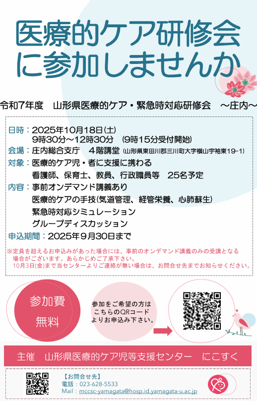 2025年10月18日(土)『山形県医療的ケア・緊急時対応研修会〜庄内〜』を庄内総合支庁にて開催いたします。普段、医療的ケアに関わられている支援者の皆様だけでなく、これから医療的ケア児の受け入れを予定している事業所や保育所の方など皆様からのご参加をお待ちしております。山形県内の小児科の先生方や山形大学医学部看護学科の先生から、正しく安全な医療的ケアについて学ぶことができる機会です。研修会についてご不明点等ございましたら、お気軽に当センターまでお問合せ下さい。皆様からのご参加をお待ちしております。朝晩の気温が下がってきましたね。季節の変わり目、体調など崩されませんようご自愛ください。                                   (山形県医療的ケア児等支援センター 看護師)