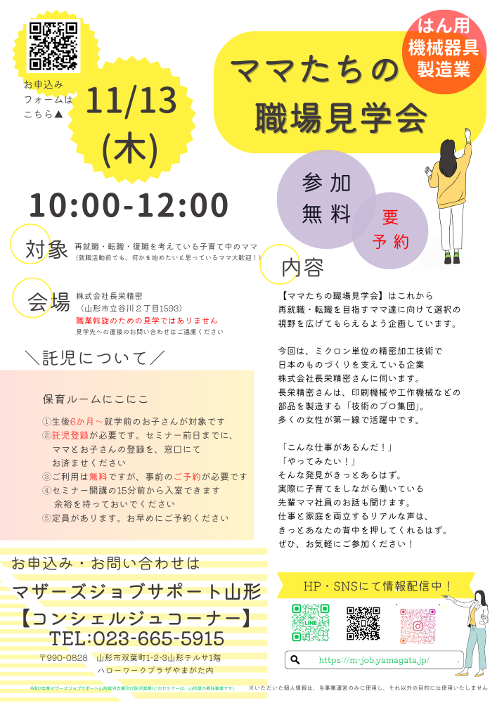 令和7年度2回目の「ママたちの職場見学会」を開催します! この見学会はこれから再就職・転職を目指すママたちに向けて選択の視野を広げてもらえるよう企画しています。 :*:☆:*:◇:*:☆:*:◇:*:☆:*:◇:*:☆:*:◇ 世の中には、いろんな職場があっていろんな仕事があって、いろんな場面でママたちが頑張っています! 日頃、目にすることができない職種のお仕事をその目でご覧になってお仕事探しの参考にしませんか? 第2回目は「株式会社長栄精密」です!ミクロン単位の精密加工技術で日本のものづくりを支えている企業で、印刷機械や工作機械などの部品を製造するお仕事です☆ぜひ一緒に、見学に行ってみましょう!子育てしながら勤務されている「先輩ママ」の経験談も聴けますよ! -------------------------------------【日時】11月13日(木)10:00〜12:00※移動はタクシーに便乗いただきます【会場】株式会社 長栄精密【託児】あり【参加料・託児料】無料-------------------------------------□お問い合わせ□マザーズジョブサポート山形【コンシェルジュコーナー】◇電話でのお申込み→023-665-5915◇お申込みメール→コチラ◇LINEでのお申込み→トーク画面にて・お名前・お申込み講座・託児の有無・お電話番号を送信してください。返信をもって申込完了となります。↓公式LINE追加はこちら↓☆メール・LINE・電話での対応は 開庁日のみとなります。 メール、LINEは開庁時間内で 返信いたします。