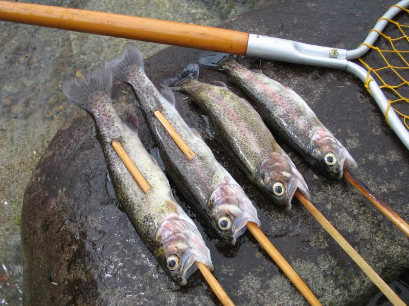 朝早くからスタッフが集まり、川にテントを張り、炭をおこし、魚をはなしてあとは子ども達を待つだけ!
