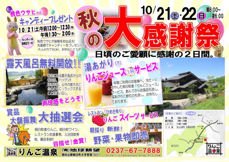 毎年恒例となりましたお客様感謝祭を開催します。露天風呂を無料開放するほか、りんごジュースのサービス桃色ウサヒもやってきます。ぜひご来館下さい。とき 10月21日(土)・22日(日)内容 ・露天風呂無料開放    ・りんごジュースのサービス(お一人様1杯)    ・桃色ウサヒからのキャンデープレゼント    ・レストラン「ひめさゆり」でお食事のお客様に               採れたてりんごを使ったスィーツのサービス    ・朝採り野菜・果実の即売     ・はずれクジなしの大抽選会 等など