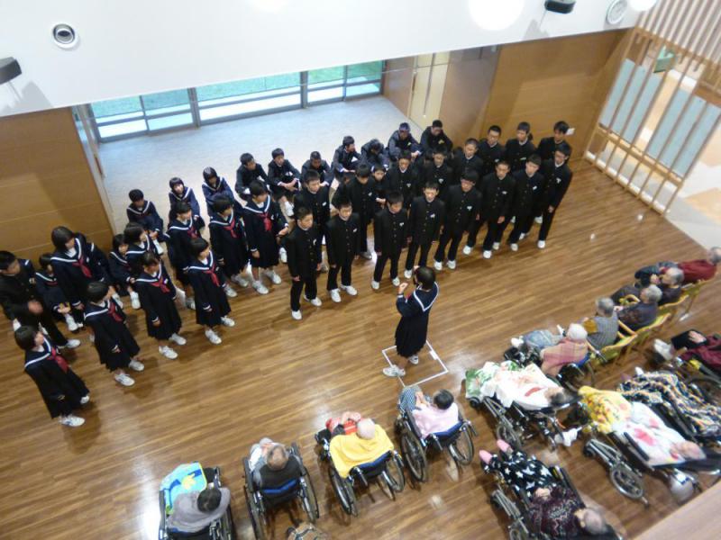 朝日中学校2年生54名が、和合荘交流ホールで合唱を披露してくださいました。披露してくれたのは今月10月28日の合唱コンクールで歌う、「ふるさと」「花は咲く」「一つの明かり」の3曲です。1曲目は童謡「ふるさと」です。この歌は、誰もが1度は耳にしたことがある馴染みある曲です。2曲目の「花は咲く」は、平成23年3月の東日本大震災の復興を応援する為に作られた有名な曲です。3曲目は「一つの明かり」です。原曲はアクアマリンという音楽ユニットが歌う曲でしたが、合唱曲に編曲し、今では全国の小中学校で歌われている曲になりました。女性パートと男性パートのハーモニーが美しく響き、入居者さんの中には「感動した。懐かしくなった。」と言葉を詰まらせながら話してくださり、涙を拭う場面も見られました。素晴らしい合唱を聴かせてくださった朝日中学校の皆さん、本当にありがとうございました。
