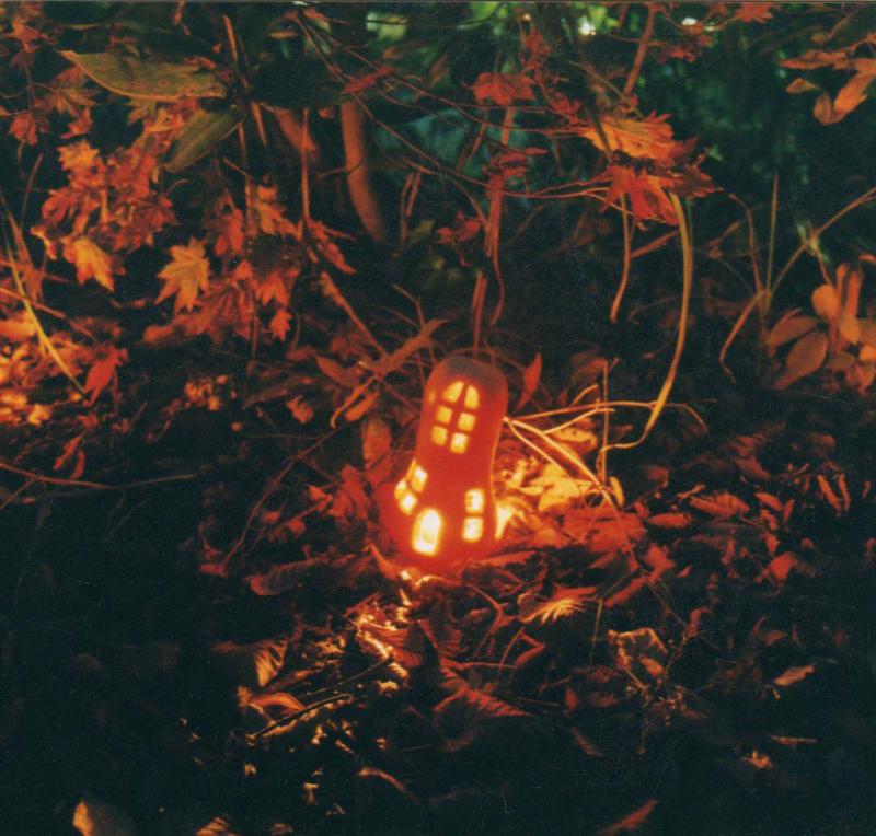 かぼちゃで小人の家形ランタンを作り、紅葉した森で灯します。