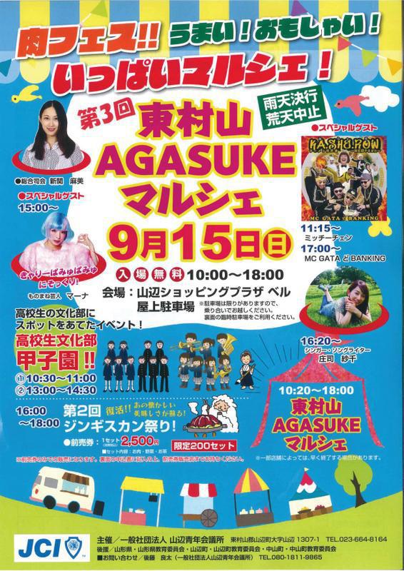 9月15日(日)に第3回東村山AGASUKEマルシェを開催します。今年の会場は山辺ショッピングセンターベル屋上駐車場となります。東村山の”うまい”屋台や、ワークショップが出展するほか、スペシャルゲストの”おもしゃい”イベントが盛りだくさん行われます(^^♪みんな大好き”肉フェス”は、復活!!ジンギスカン祭り!ヘルシーで栄養満点のジンギスカンが味わえます。東村山の魅力がたっぷり詰まった「AGASUKEマルシェ」にぜひお越しください!! 第3回東村山AGASUKEマルシェ日 時 2019月年9月15日(土) 10:00〜18:00会 場 山辺ショッピングセンターベル屋上駐車場 お問い合わせ 一般社団法人山辺青年会議所 TEL:080−1811−9865(後藤)