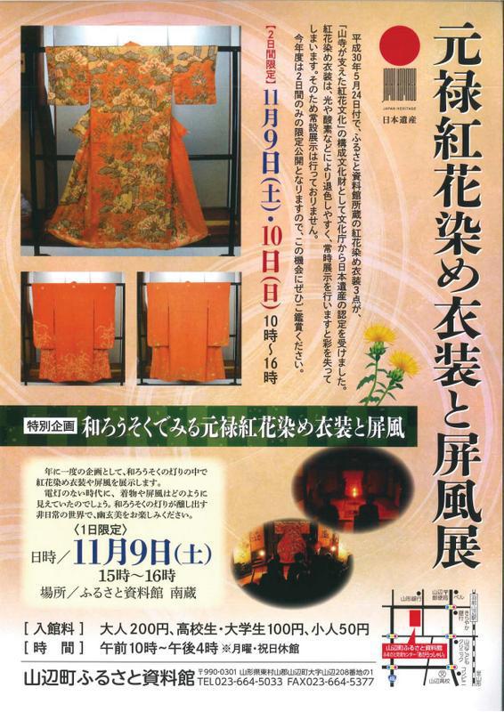 ふるさと資料館所蔵の紅花染め衣装3点が、11月9(土)、10(日)の2日間に限定公開されます。この紅花染め衣装は、平成30年に「山寺が支えた紅花文化」の構成文化財として文化庁より日本遺産の認定を受けた貴重な品物です。今年度は2日間のみの公開となってなってますので、この機会にぜひご覧下さい。 元禄紅花染め衣装と屏風展□日  時   令和元年11月9日(土)、10日(日)□場  所   ふるさと資料館□時  間   10時〜16時□入館料   大人200円、高校生・大学生100円、小人50円□お問合せ先  山辺町ふるさと資料館            TEL:023−664−5033 なお、11月9日(土)15時〜16時は、特別企画「和ろうそくみる元禄紅花染め衣装と屏風展」として、和ろうそくの灯りの中で紅花染め衣装や屏風を展示します。