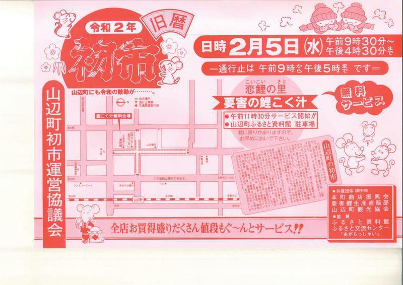 今日2月5日(水)は、旧暦の初市が開かれます。本町、駅前、仲町通りには縁起物のだんご木や初あめ、木工品等の出店が立ち並びます。11時30分からは、山辺町の特産品の鯉がたっぷり入った「鯉こく汁」の無料振舞いも行われます。皆様のたくさんのお越しをお待ちしています。『旧暦初市』 日時   令和2年2月5日(水)   時間   午前9時30分〜午後4時30分 振舞い  鯉こく汁 11時30分〜  場所・・・ふるさと資料館駐車場(本町) お問せ先 山辺町初市運営協議会        電話・・023−664−5939(山辺町商工会内)