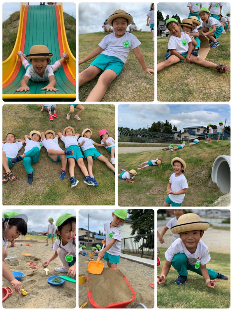 すべったり、芝生の山をゴロゴロ転がったり、
