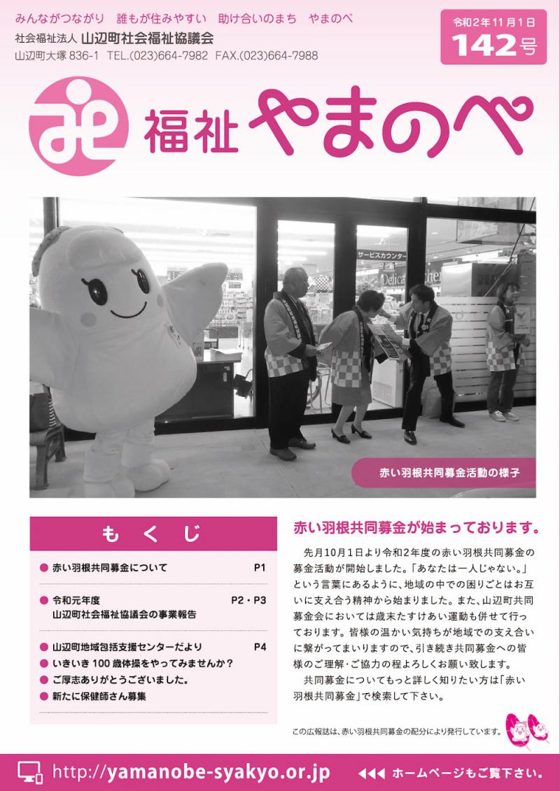 「福祉やまのべ142号」では、令和元年度山辺町社会福祉協議会の事業報告や赤い羽根共同募金についてを掲載しております。またその他にも、●山辺町地域包括センターより 「風邪や感染症に負けない体作りを心がけましょう」 「いきいき100歳体操をやってみませんか」●令和2年度の山辺町社会福祉協議会事業について●新たに看護師さん募集●ご厚志ありがとうございましたといった情報を掲載しておりますのでどうぞご覧ください。→ 山辺町社会福祉協議会・広報誌142号(PDF)