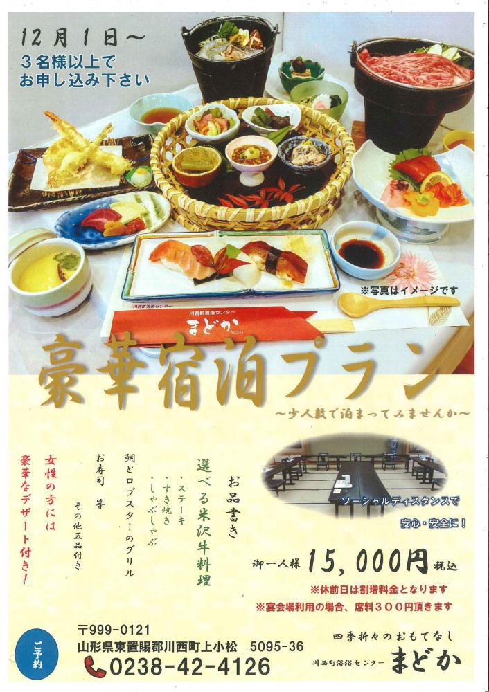 まどか豪華宿泊プラン12月〜 お一人様15000円税込(1泊2食付)の新たなプランが出来ました!!Gotoトラベルで今なら35%引きで約9,750円でご利用できます。※その他15%分の地域クーポン券がつきます。(飲み物代・お土産代等にご利用できます/// 宿泊人数の合計となります)※地域クーポンは、宿泊した当日と翌日までの期限となっております。お品書き選べる米沢牛料理 ステーキorすき焼きorしゃぶしゃぶの中から1種類鯛とロブスターのグリル、お寿司その他5品※女性の方限定で豪華なデザート付き※休前日は割増料金となります。※3名様以上〜の料金となります(人数によって変わります)※宴会場ご利用の場合別途お席料としてお一人様300円込み頂きます。※Gotoトラベルはこのプラン以外にも、まどかでは、1泊2食付11,330円税込のコースからご利用できます。(35%引きで約7,365円・地域クーポン券15%分も付きます・・・宿泊人数の合計となります)※少人数で気の合う仲間、ご家族、ご兄弟で泊まってみませんか?※お席はソーシャルディスタンスで配席して、安心安全でご利用いただけるよう感染症対策をしてお待ちいたしております。