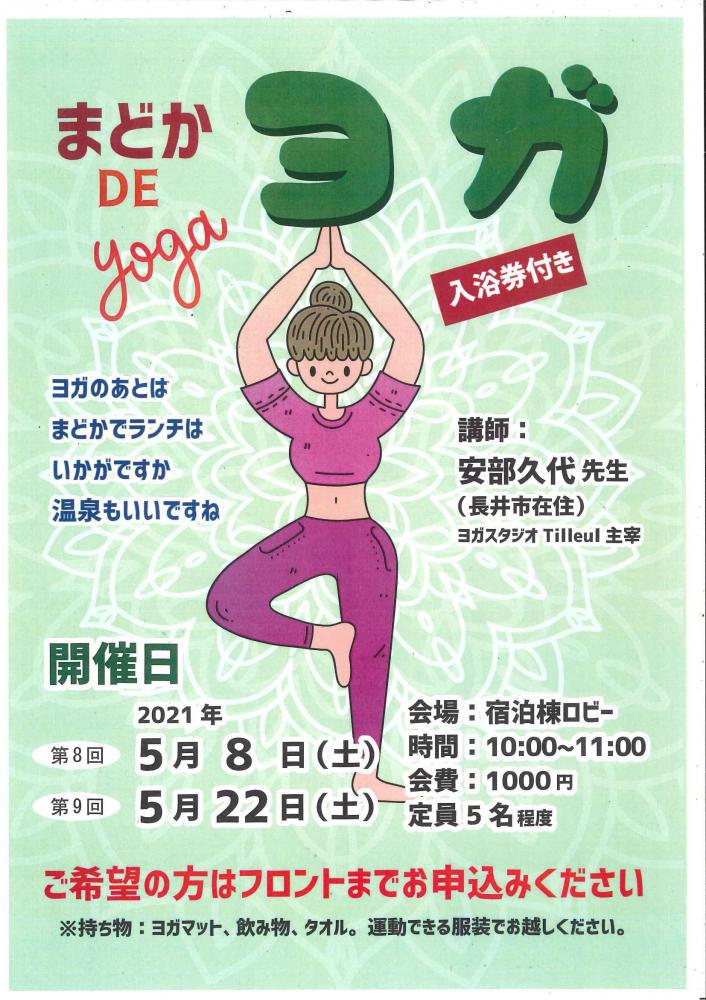 まどかDEヨガ5月の日程です!!ヨガでリフレッシュして、ヨガの後はまどかでランチはいかがですか?温泉もいいですね♪2021年5月22日(土) 会場:まどか宿泊棟ロビー時間:10:00〜11:00会費:1,000円定員:5名持ち物:ヨガマット・飲み物・タオル・運動できる服装でお越し下さい。※ご希望の方は、まどかフロントまでお申込み下さい。