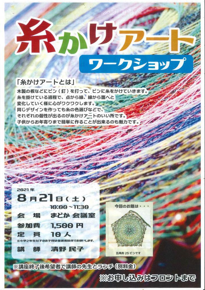 糸かけアートワークショップ開催8月21日(土)10:00〜11:30まどか会議室参加費1,500円定員10名講師:清野民子※講座終了後希望者で講師の先生とランチ(別料金)今回は五角形25ピンです!!※お申込みはまどかフロントまで!!TEL0238-42-4126