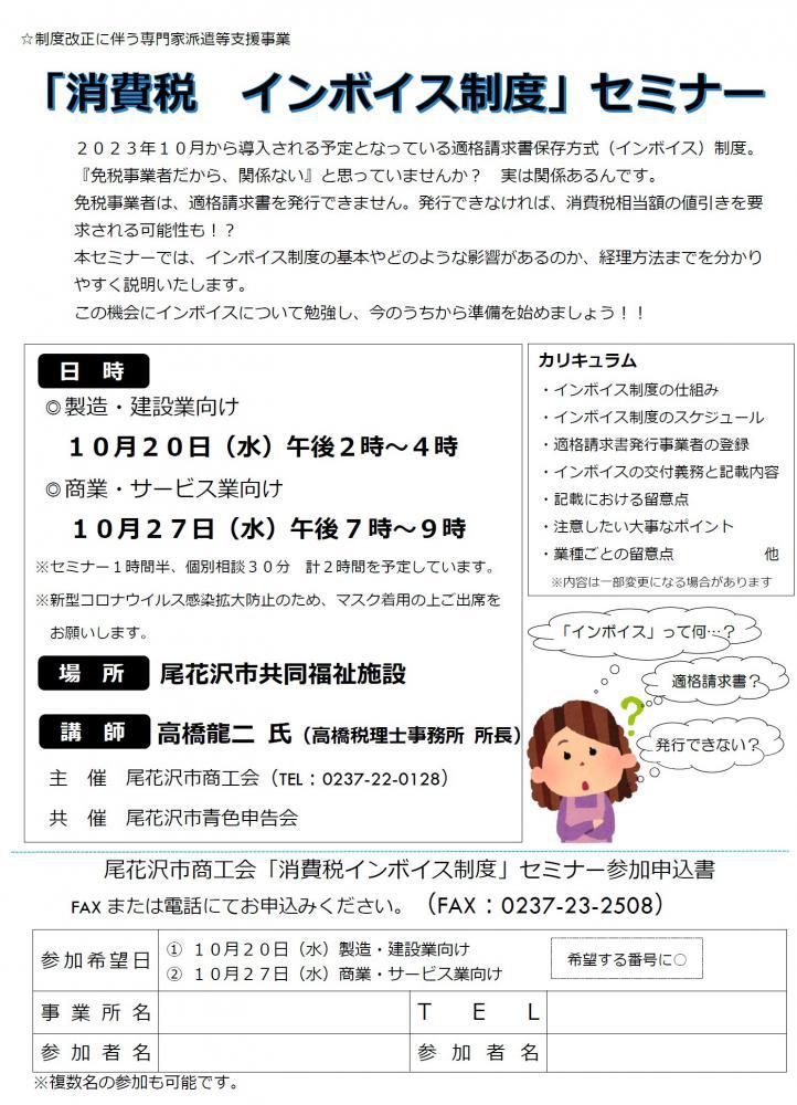 2023年10月から導入される予定となっている適格請求書保存方式(インボイス)制度。『免税事業者だから、関係ない』と思っていませんか? 実は関係あるんです。免税事業者は、適格請求書を発行できません。発行できなければ、消費税相当額の値引きを要求される可能性も!?本セミナーでは、インボイス制度の基本やどのような影響があるのか、経理方法までを分かりやすく説明いたします。添付の参加申込書にて申込していただき、ぜひご参加ください。