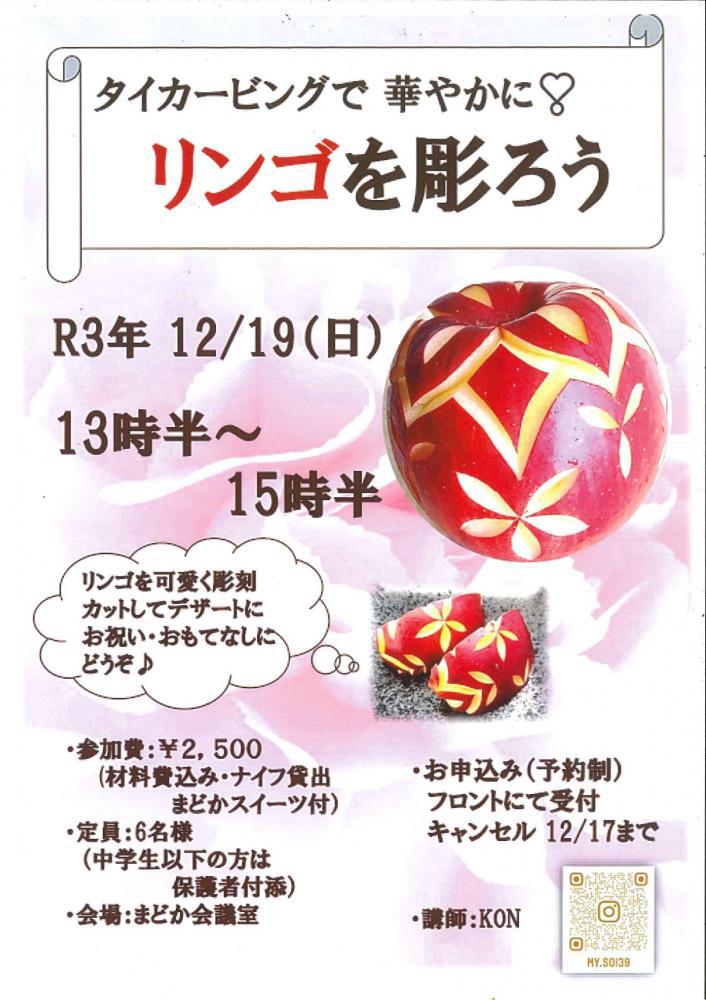 タイカービングで華やかにリンゴを彫ろう♪R3.12/19(日) 講師:KON 時間:13時30分〜15時30 場所:まどか会議室 参加料:2,500円(材料費込み・ナイフ貸出し・まどかスイーツ付) 定員:6名(中学生以下の方は保護者付添い)※お申込みはまどかフロントまで(予約制)※キャンセルは12/17まで
