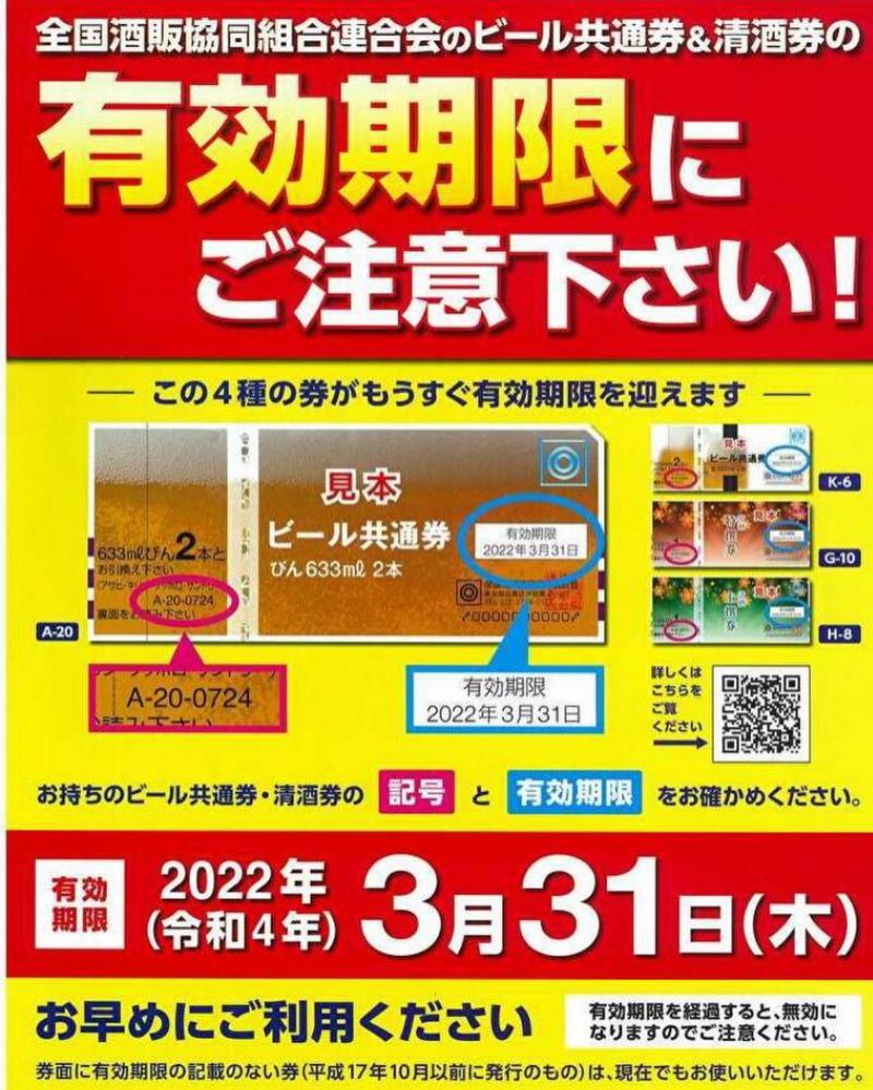 ※ 有効期限がない券については、発行当時の標準的小売価格に基づいて発行されておりますので、酒販店の販売価格により、不足額をお支払いいただく場合があります。