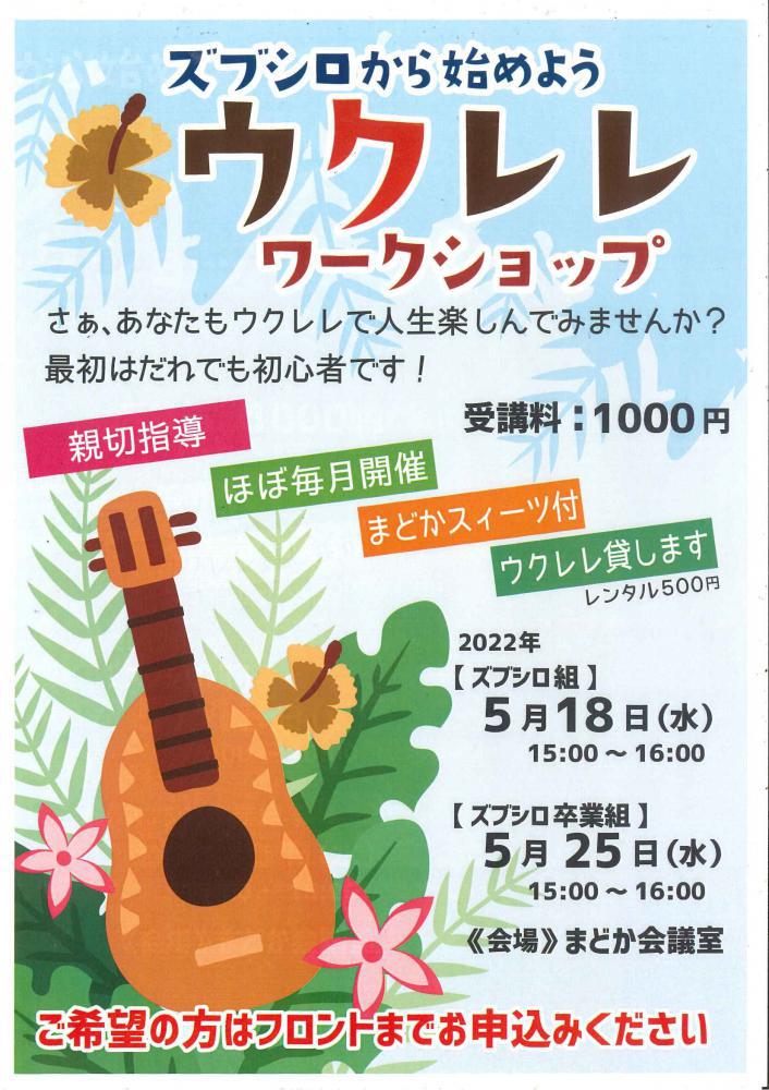2022:ウクレレワークショップ開催 あなたもウクレレで人生楽しんでみませんか?最初は誰でも初心者・ズブシロです!!スブシロからはじめてみませんか?5月・6月日程●親切指導 ●ほぼ毎月開催 ●まどかスイーツ付 ●ウクレレレンタル可:レンタル料500円 【ズブシロ組】  5月18日(水) 15:00〜16:00【ズブシロ卒業組】5月25日(水) 15:00〜16:00  レッスン終了後は、まどかのスイーツでほっとひと息いかがですか?会場:まどか会議室 受講料:1,000円※ご希望の方はまどかにお電話でお申込み下さい TEL0238-42-4126(ヨイフロ)まで6月も日程決まってますのでご案内いたします♪  【ズブシロ組】  6月8日(水) 15:00〜16:00【ズブシロ卒業組】6月29日(水) 15:00〜16:00  ※ハーブガーデンフェア開催中ですので、特別企画で  ハーブティーを飲みながらハーブな曲を奏でてみませんか?