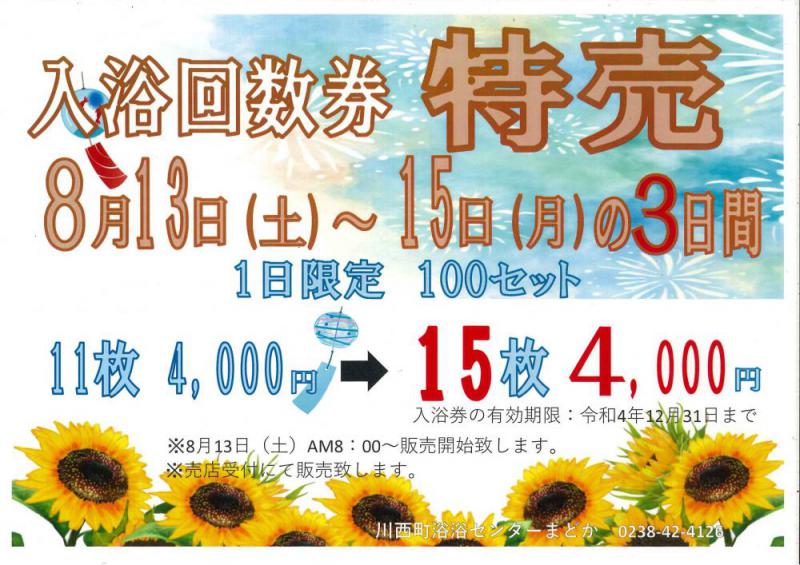 8月13日〜15日の3日間一日限定100セット11枚で4000円の所+4枚(R4.12/31期限)で15枚で 4,000円※8月13日のみ営業時間が変更となり、18:30最終受付、19:00終了 となります。ご了承下さいませ。