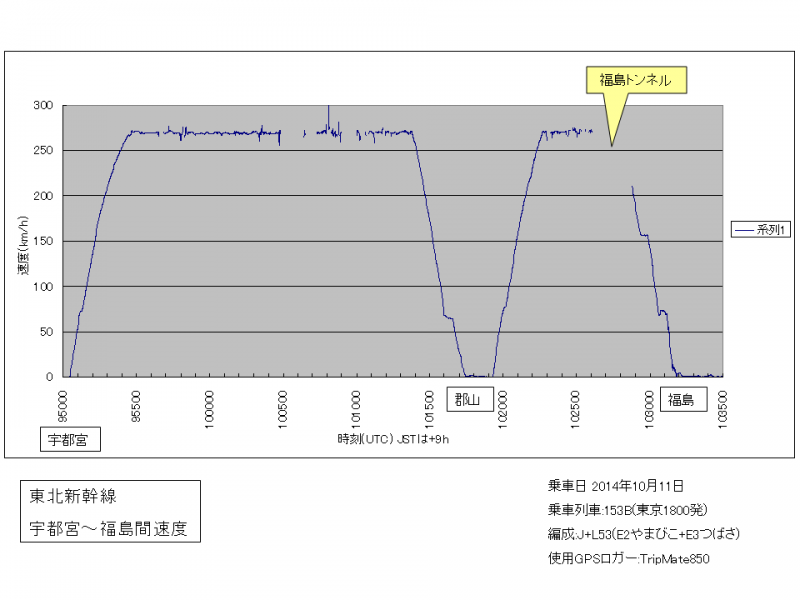 次のグラフは、新白河通過から郡山停車まで拡大したもの。