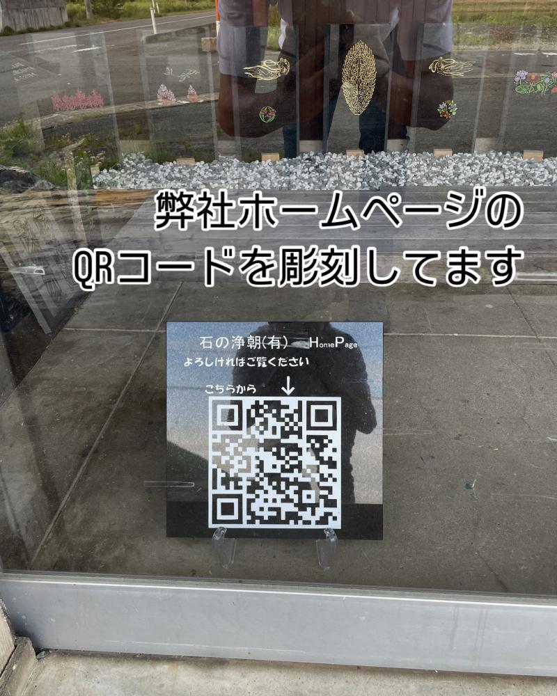 弊社ホームページのQRコードを黒御影石に彫刻・着色を施しております。2年程前に製作し、現在は私のとんでもない不注意によりバラバラに破損してしまいました。なんとか並べて、なんとか読み取れる現在になっております。写真は破損前のものです!