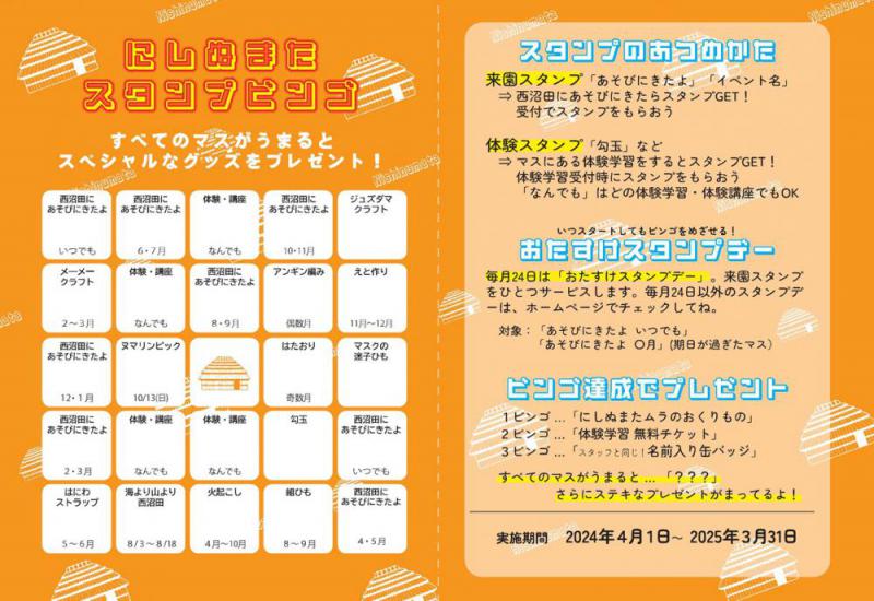 現在のにしぬまたスタンプビンゴは3月31日まで。ビンゴ達成やスタンプコンプリートに向けてご活用ください! ◆ラストスパート!おたすけスタンプデー1/24(金)、1/25(土)、2/22(土)、2/23(日)、2/24(月・祝)、3/22(土)、3/23(日)※3/23午前は、土器づくり講座開催のため一般の体験学習はお休みです(来園スタンプは押印できます) ◆おたすけスタンプデーとは?来園スタンプをひとつサービスします対象となるマスは「あそびにきたよ いつでも」「あそびにきたよ ○月」です
