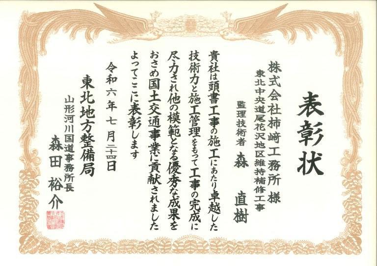 令和6年7月24日に国土交通省東北地方整備局山形河川国道事務所長より、優良工事施工者として表彰されました。また、監理技術者として担当されました「森 直樹」さんが、優良工事技術者として表彰されました。