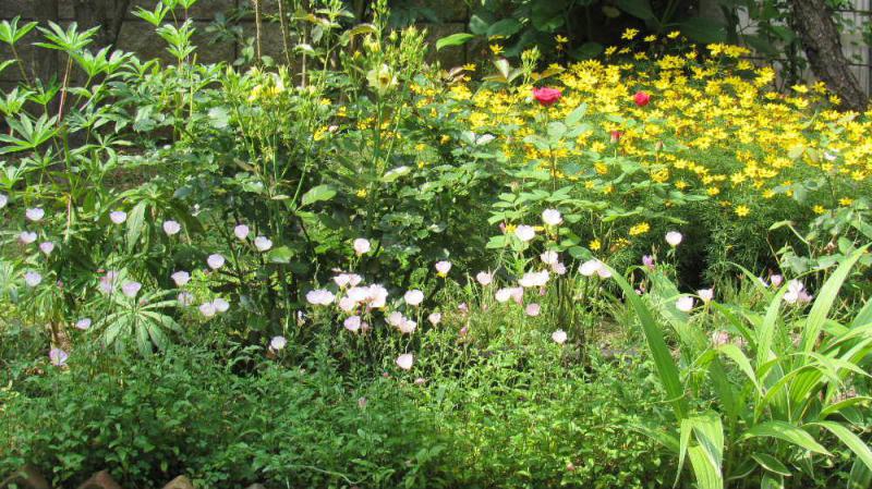 ●あまり雨も降らず庭の花も喘ぎ喘ぎ花を咲かせているようです 黄色、ピンク 赤と花のグラディ―ションが庭を彩っています あまりの暑さに草花の成長がイマイチで花の月もあまりよくありません ちょっこと雨が降りましたがもう少し一雨も二雨もほしいこの頃です