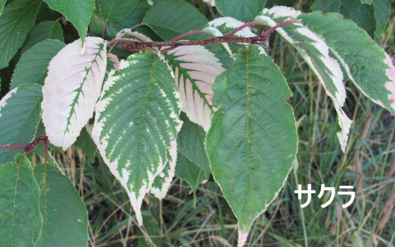 ●「ハンゲショウ?」散歩の途中 桜並木の一本の桜の根元付近に緑の葉が部分的に白くなっている葉を見つけました「ハンゲショウ」のように思われて写真をとりました 「ハンゲショウ」は緑の葉に白いペンキを半分塗ったような植物です「半化粧」あるいは「半夏生」と書き虫媒花ということで虫を誘う必要があるので白く目立つように進化したのではないかともいわれています 写真は桜の葉です