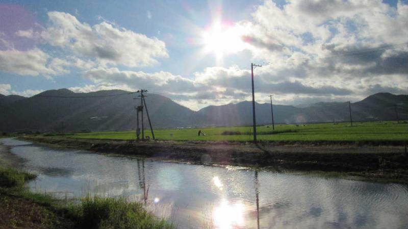 ●昨日は梅雨があけたと思ったら猛烈な暑い一日なりました 今日の山形市の最高気温が38度になるとか いよいよ本格的な夏がやってきました 周りの田んぼが鮮やかな緑となり今にも穂がでるのではないかとという風景が一面に広がっています 田んぼの水路には朝日が照り返し暑さを予感させています 私の苦手な暑い夏がやってきました