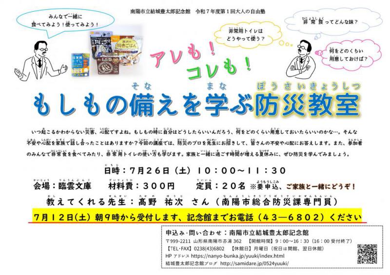 7月26日(土)10時から、大人の自由塾(子どもも可♪)「アレもコレも!もしもの備えを学ぶ体験型防災教室」を開催いたします。非常食の試食や、非常トイレの使い方など、体験型の防災教室です。災害用伝言ダイヤル171の使い方も詳しくご紹介いたします。ぜひ皆様ご参加ください。