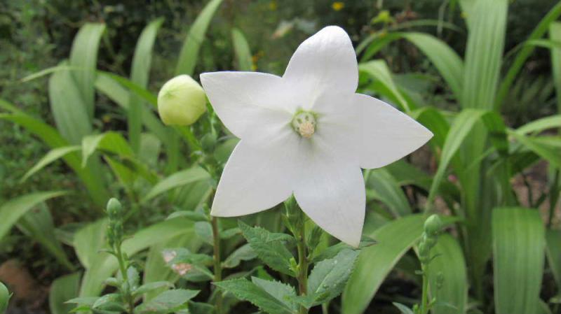 ●風船のような淡い緑の蕾が開き真っ白な「キキョウが開花しました 「キキョウ」の蕾は咲く寸前までふんわり膨らんで紙風船の様な形をしています 花が咲く瞬間に音でもたてて咲きそうな可愛らしい雰囲気が魅力的です 可愛い可憐な花ですが暑さでしおれてしまうこともあり暑さが恨めしくなります