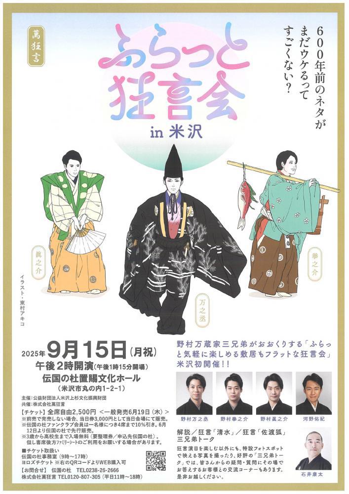 伝国の杜置賜文化ホールにて、ふらっと狂言会を開催します。野村万蔵家三兄弟がおおくりする「ふらっと気軽に楽しめる敷居もフラットな狂言会」で、米沢初開催となります。ぜひ、ご来場ください!<日時>令和7年9月15日(月・祝) 開演14:00(開場13:15)<場所>伝国の杜置賜文化ホール<料金>全席自由 2,500円<問い合わせ・購入先>伝国の杜 TEL:0238-26-2666詳細は、チラシをご覧ください。