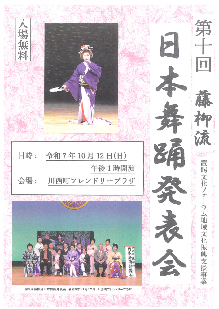 置賜総合支庁、置賜3市5町の文化行政担当部局、各市町の芸術文化協会などで組織する置賜文化フォーラムでは、置賜地域の文化振興と地域活性化を図ることを目的に、置賜地域の住民が主体となった文化事業に対し、補助金を交付しています。今年度採択された「藤柳流日本舞踊藤柳会」では、第十回発表会を開催します。大人だけでなく、小学生による発表も行われます。ぜひ、ご来場ください。<開催日時>令和7年10月12日(日) 開演:13:00<場所>川西町フレンドリープラザ<入場料>無料 詳細はコチラ