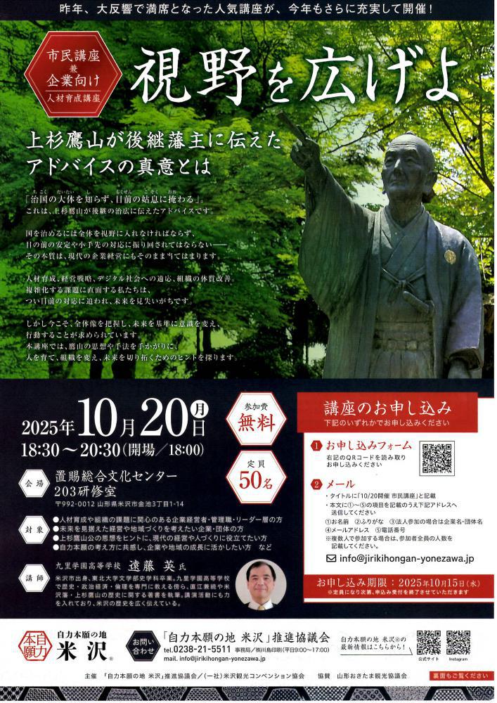 市民講座兼企業向け人材育成講座「視野を広げよ〜上杉鷹山が後継藩主に伝えたアドバイスの真意とは〜」10/20(月)開催・参加費無料!昨年、大反響で満席となった人気講座が、今年もさらに充実して開催!「治国(ちこく)の大体を知らずに、目前の姑息に掩(おお)わる」。これは、上杉鷹山が後継の治広に伝えたアドバイスです。国を治めるには全体を視野に入れなければならず、目の前の安定や小手先の対応に振り回されてはならない―。その本質は、現代の企業経営にもそのまま当てはまります。人材育成、経営戦略、デジタル社会への適応、組織の体質改善。複雑化する課題に直面する私たちは、つい目前の対応に追われ、未来を見失いがちです。しかし今こそ、全体像を把握し、未来を基準に意識を変え、行動することが求められています。本講座では、鷹山の思想や手法を手がかりに、人を育て、組織を変え、未来を切り拓くためのヒントを探ります。参加費無料ですので、ぜひご参加ください!◇開催日時 2025年10月20日(月) 18:30〜20:30(開場/18:00)◇会 場 置賜総合文化センター 203研修室 (米沢市金池3丁目1-14)◇対 象 ・人材育成や組織の課題に関心のある企業経営者・管理職・リーダー層の方・未来を見据えた経営や地域づくりを考えたい企業・団体の方・上杉鷹山公の思想をヒントに、現代の経営や人づくりに役立てたい方・自力本願の考え方に共感し、企業や地域の成長に活かしたい方 など◇定 員 50名◇講 師 九里学園高等学校 遠藤 英 氏◇講座のお申し込み1)チラシのQRコードから2)メールから・タイトルに「10/20開催 市民講座」と記載・本文に@お名前AふりがなB法人参加の場合は企業名・団体名CメールアドレスD電話番号を記載の上、下記アドレスへ送信してください。※複数人で参加する場合は、参加者全員の人数を記載してください。メール info@jirikihongan-yonezawa.jp◇お申し込み期限 2025年10月15日(水)※定員になり次第、申込み受付を終了させていただきます。【お問い合わせ】「自力本願の地 米沢」推進協議会事務局/叶島印刷(平日9:00〜17:00)TEL:0238-21-5111