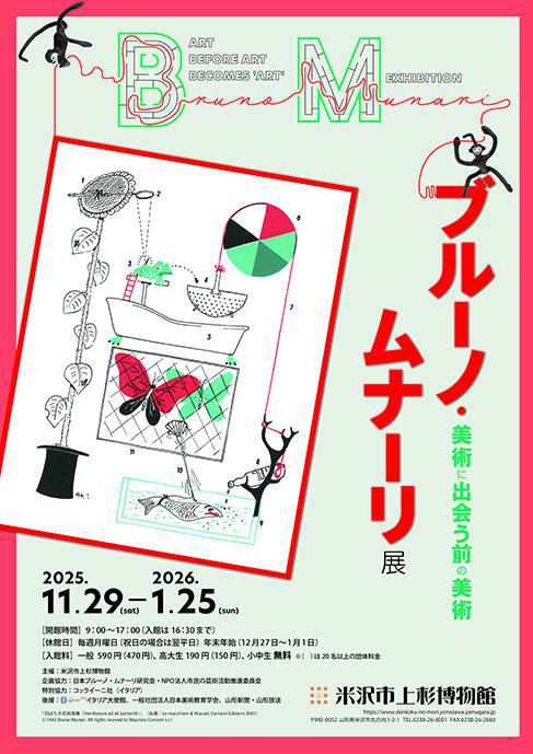 11月29日(土)よりはじまる企画展のお知らせです。 企画展「ブルーノ・ムナーリ展 美術に出会う前の美術」 誰もが持つ、自由な創造のスイッチがここにあります。 敷居が高い、よくわからないと思われがちな「美術」。ブルーノ・ムナーリ(1907−1998)は、そんな「美術」の垣根を取り払い、日常の中にある形や、色、デザインの面白さや美しさに気づかせてくれるイタリアのアーティストです。ムナーリは、プロダクトデザイン、グラフィックデザイン、絵本の制作、子どものための造形教育など多岐わたる分野で活躍し、独創的でユーモアあふれる作品を世に送り出しました。アートは、鑑賞の対象であるだけでなく、メッセージを伝える手段や、想像力を刺激するきっかけでもあり、何よりも楽しめるものであるべきだと考えたムナーリは、人が豊かな生活を送るためのアートを様々なかたちで発表しました。 本展は、約300点の作品や資料を通じ、視覚的な要素による伝達力や日常の中にあるアートの種をかたちにする楽しさを実感してもらう展覧会です。言葉はいらない、もう一つのアートの力に気づくことができます。 【会期】11月29日(土)〜令和8年1月25日(日) 【休館日】毎週月曜日(祝日の場合は翌日)、年末年始(12/27〜1/1) 【開館時間】9:00〜17:00(チケット販売は16:30まで) 【入館料】一般590円(470円) 高大生190円(150円) 小中生無料 ※( )は20名以上の団体料金 ■ギャラリートーク ※申込不要、要展覧会チケット 担当学芸員による展示解説「ブルーノ・ムナーリの魔法」 日 時:11月29日(土)10:00〜 ■募集制ワークショップ つくろう! みつけよう! 「サラダ菜のバラでエコバッグ」 ※申込受付 11/12(水)9:00〜 日 時:12月13日(土) @10:00〜12:00 対象:未就学児 A13:30〜16:00 対象:小学生以上 対 象:@A 各15名 参加費:500円 ■募集制ワークショップ ナイトツアーようこそ夜の博物館へ 「ムナーリとあそぼう」 ※申込受付 11/19(水)9:00〜 日 時:12月19日(金)19:00〜20:30 対 象:どなたでも(中学生以下は保護者同伴)20名 参加費:500円 ■募集制ワークショップ つくろう!みつけよう!「おりたためる彫刻をつくろう」 ※申込受付 12/10(水)9:00〜 日 時:2026年 1月10日(土)13:30〜16:00 対 象:小学生以上 15名 参加費:500円 特別展の主な展示資料等、詳しくは当館ホームページをご覧ください。 皆様のご来館を心よりお待ちしております! 【お問い合わせ】 米沢市上杉博物館 0238-26-8001