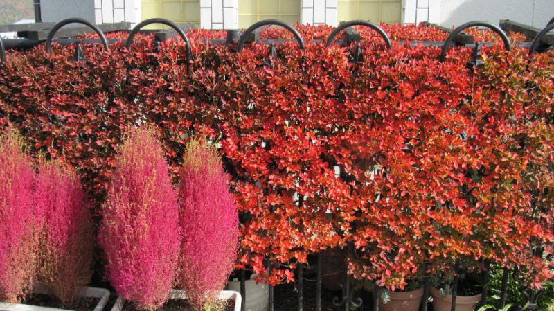 ●深い霧が一面に風景を薄墨のように覆っています 昼近くになると霧も晴れようやく周りの秋の風景になります 玄関前の「ドウタン」と「コキア」がようやく色づいてきました でも夕焼けにはまだかなわないかなあ 真っ赤になるまでもう少しです