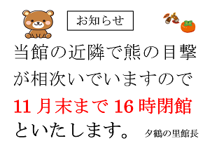 当館の近隣で熊の目撃が相次いでいますので、